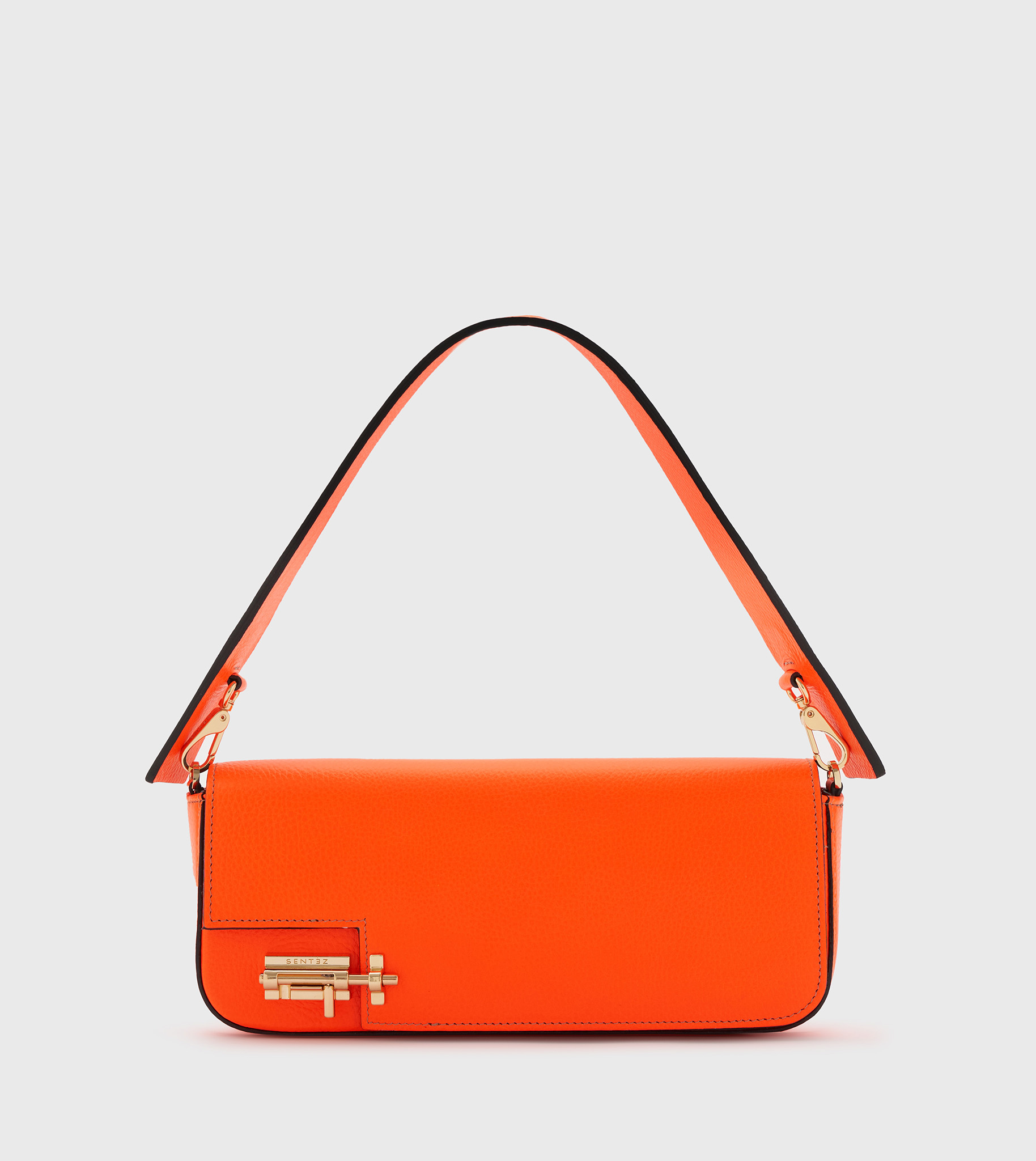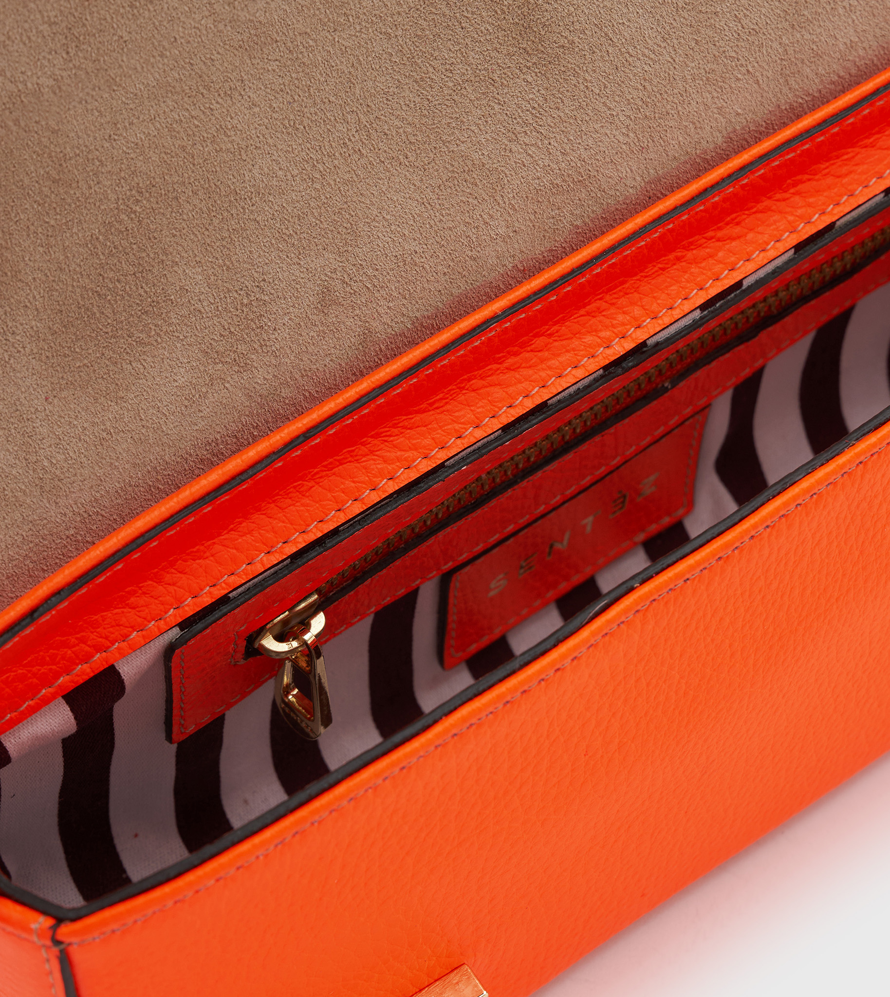 Bolso de piel con solapa irregular . Cierra con herraje traba exclusivo Sentèz y broche imán. Forrado con algodón 100% con estampa exclusiva Sentèz. Bolsillo interno plaqué. Asa de hombro desmontable rígida.