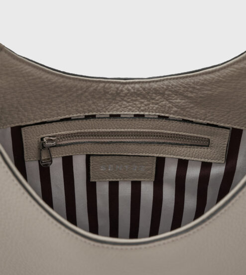 Bolso de piel, cierra con rabillo central con herraje exclusivo de la marca con imán incorporado. Forrado en algodón 100% con estampa exclusiva Sentèz. Bolsillo interno con cremallera. Asa media para uso de hombro. Herrajes: Oro o plata según base de color.