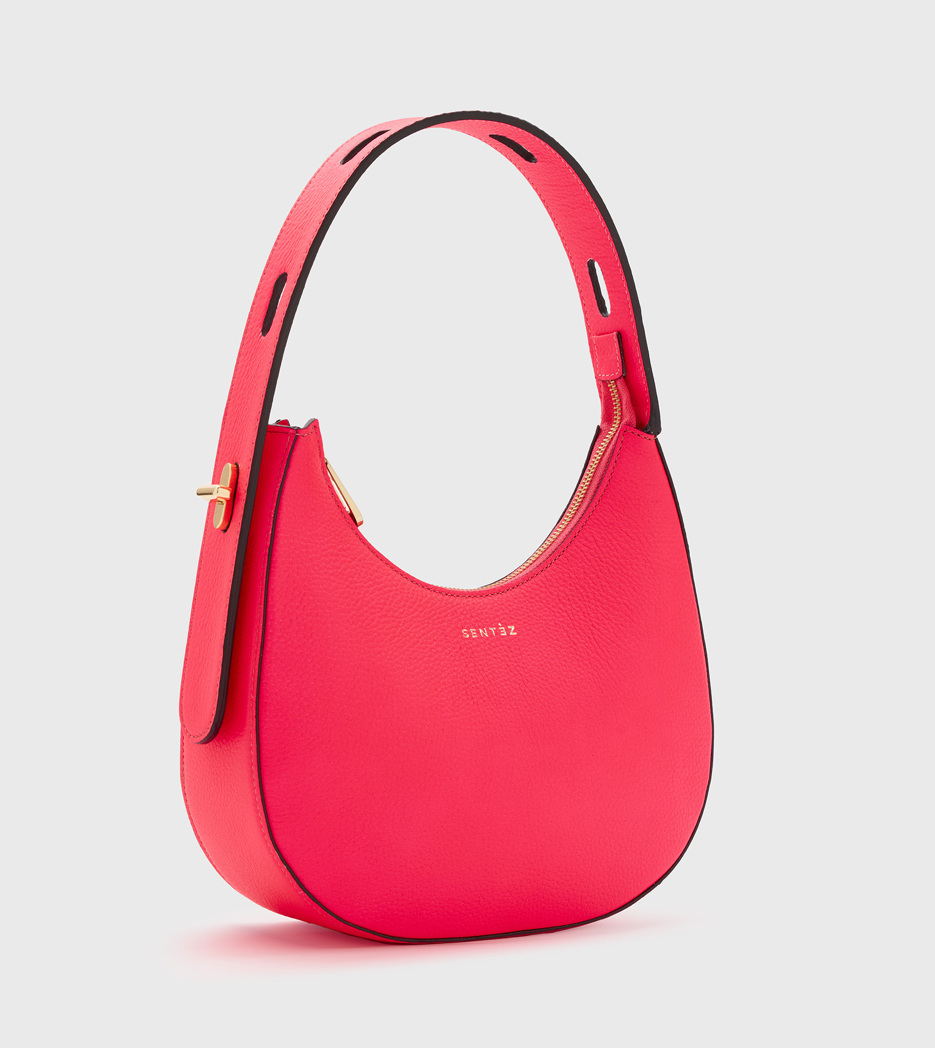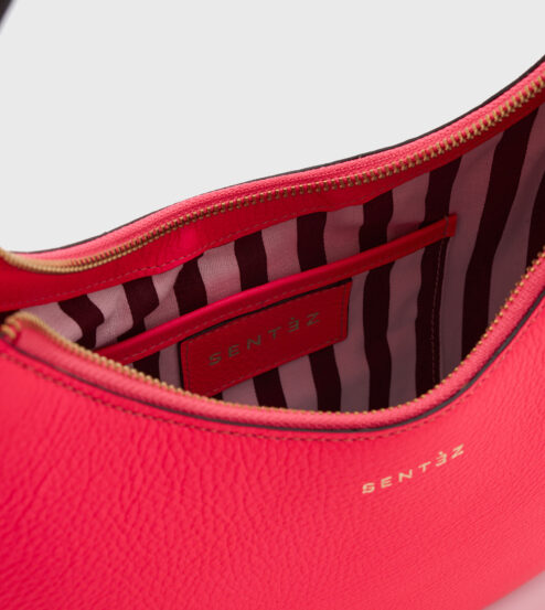 Bolso de piel , cierra con cremallera. Forrado con algodón 100% con estampa exclusiva Sentèz. Asa regulable con torniquete lateral giratorio y ojales para 5 opciones de uso, según la ocasión.