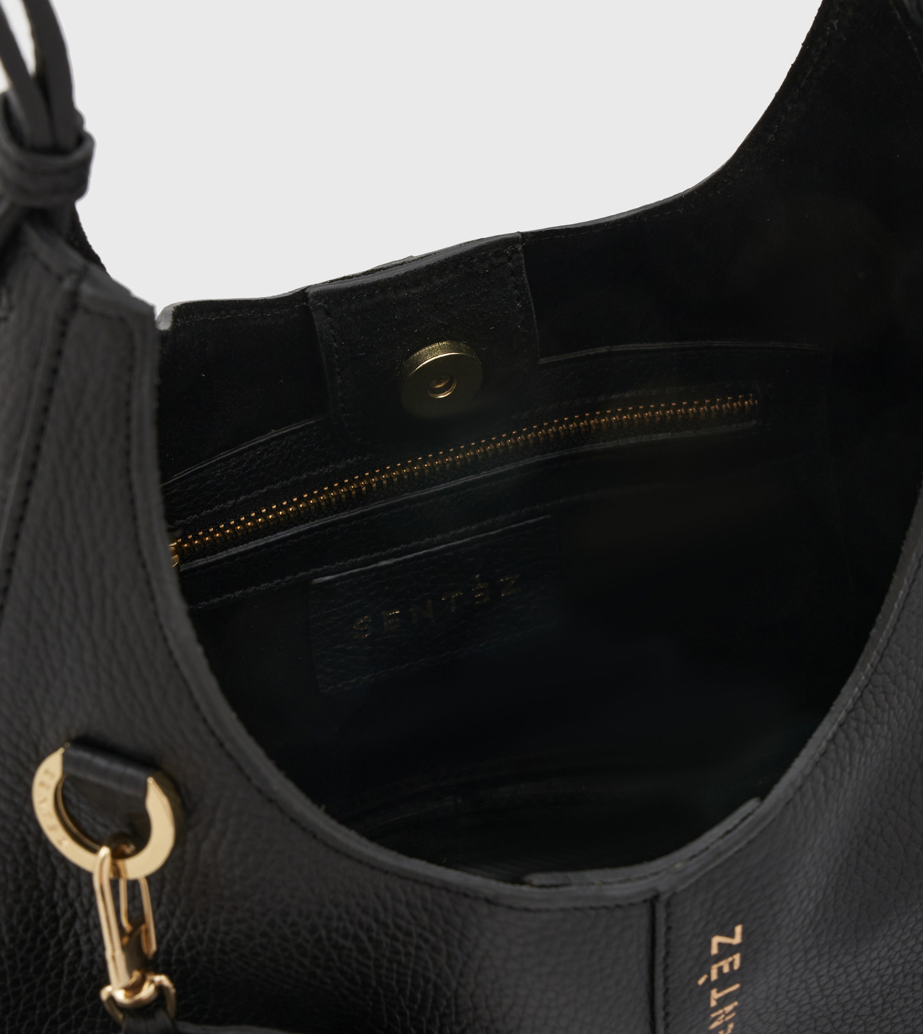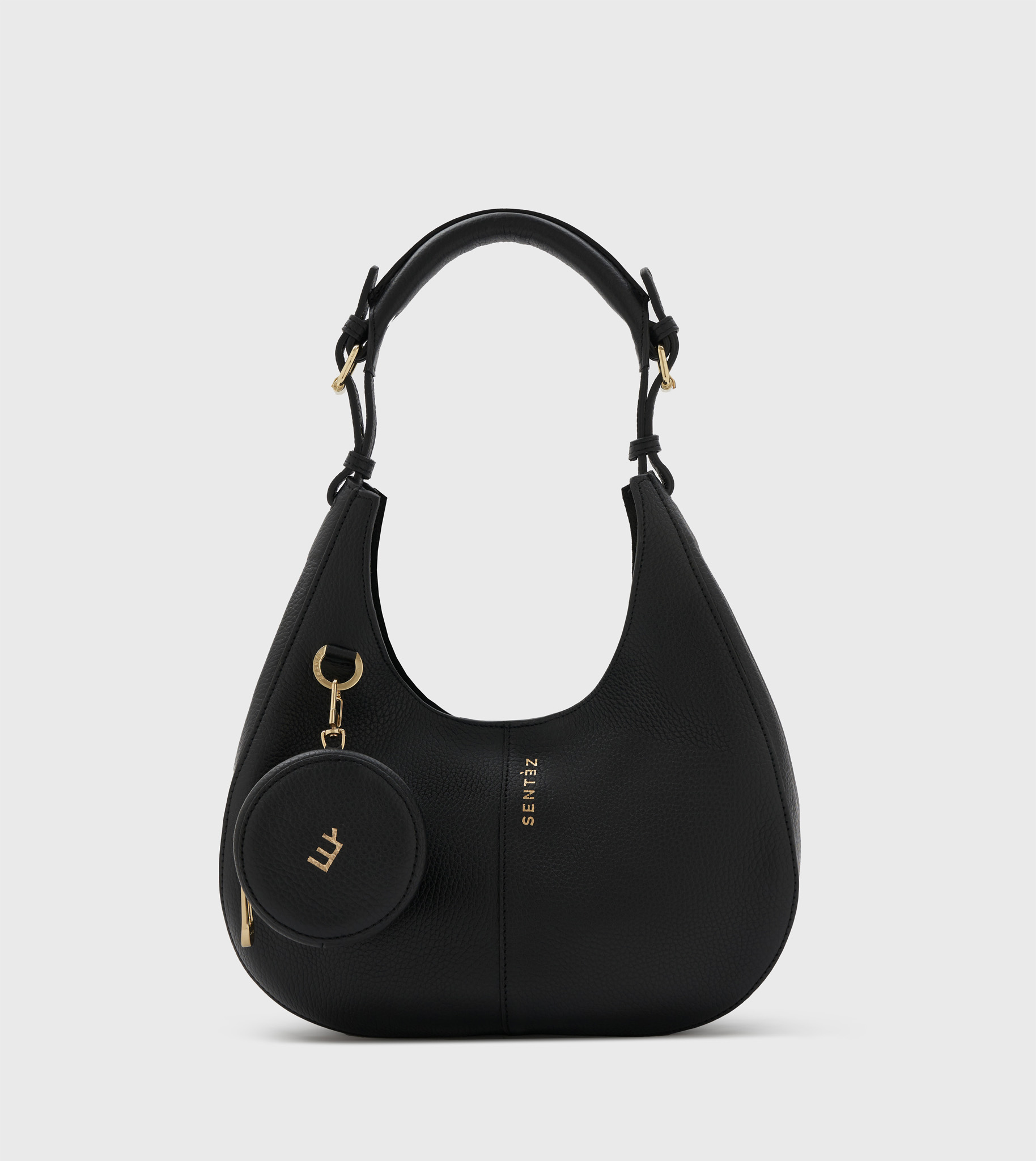 Bolso mórbido de piel. Cierra con rabillo interno con imán. Lleva en la tapa delantera un monedero colgante extraíble, de tamaño ideal para llaves. Se puede cambiar por otro accesorio sentèz y así customizarlo para cada ocasión. Forrado en piel gamuzada a contracolor lo que lo hace muy sofisticado y especial. Logo de marca impreso en tapa delantera. Asa larga ¾ extensible para uso de hombro.