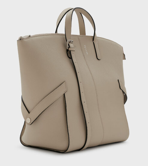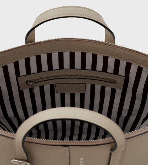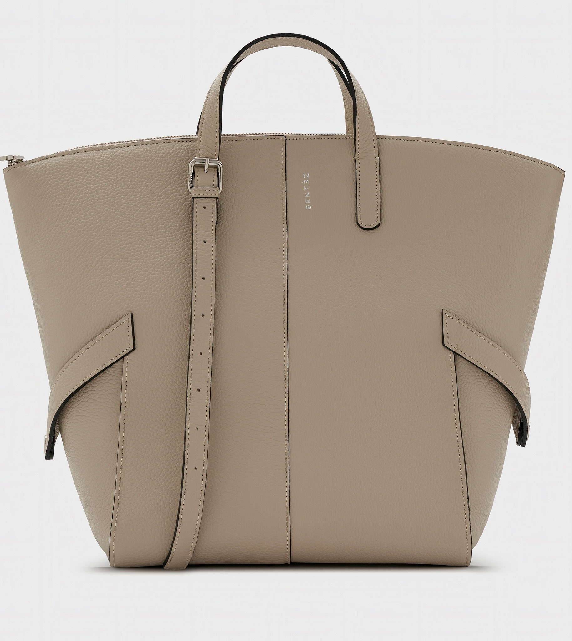Bolso de piel, cierra con cremallera metálica. Forrado en algodón 100% con estampa exclusiva Sentèz. Un bolsillo interno con cremallera, otro plaqué de gran tamaño. Asas regulables con hebilla asimétrica para uso de mano o de hombro.