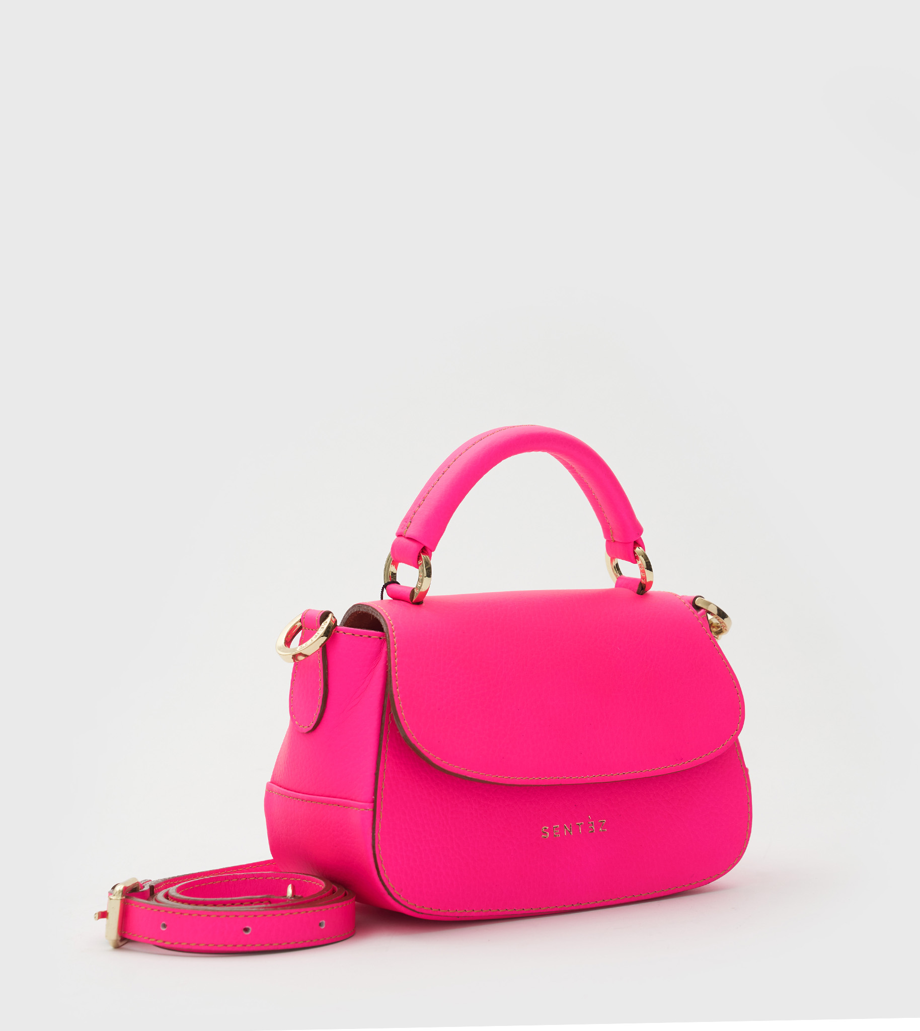 Bolso de piel con solapa, cierra con broche imán central. Forrado en algodón 100% con estampa exclusiva Sentèz. Un bolsillo interno plaqué. Asa larga removible y extensible para uso bandolera o de hombro de 1,04 m. Logo de marca en tapa delantera. Herrajes oro/plata según base de color.