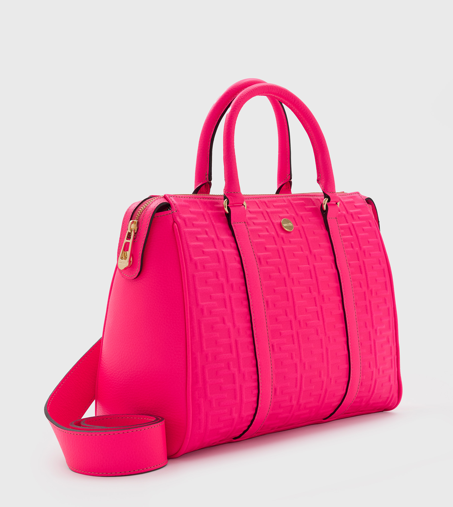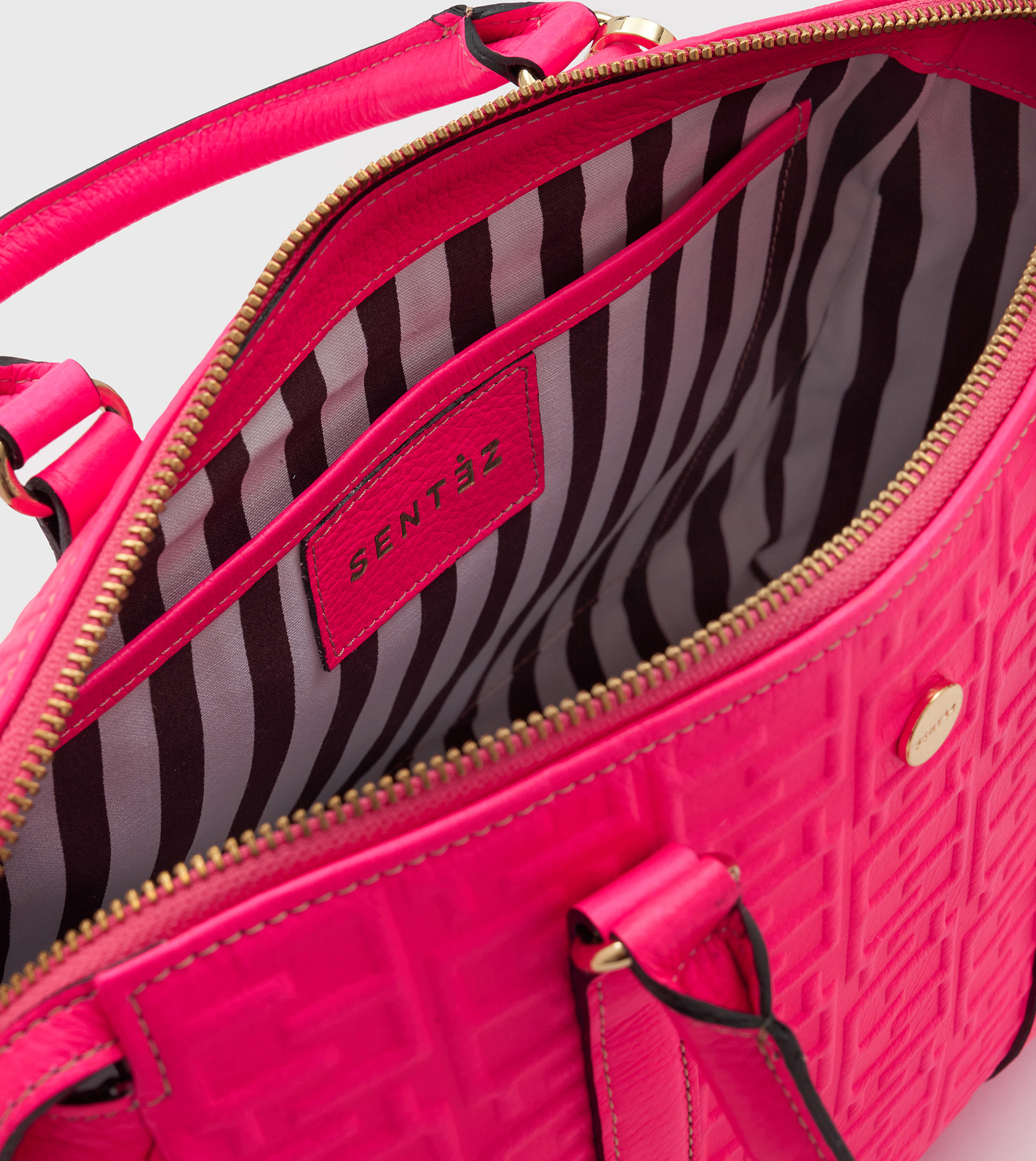 Bolso de piel texturada, cierra con cremallera. Dos asas fijas cortas para uso de mano y otra larga para uso de hombro o bandolera. Forrado en algodón 100% con estampa exclusiva Sentèz. Dos bolsillos internos plaqué.