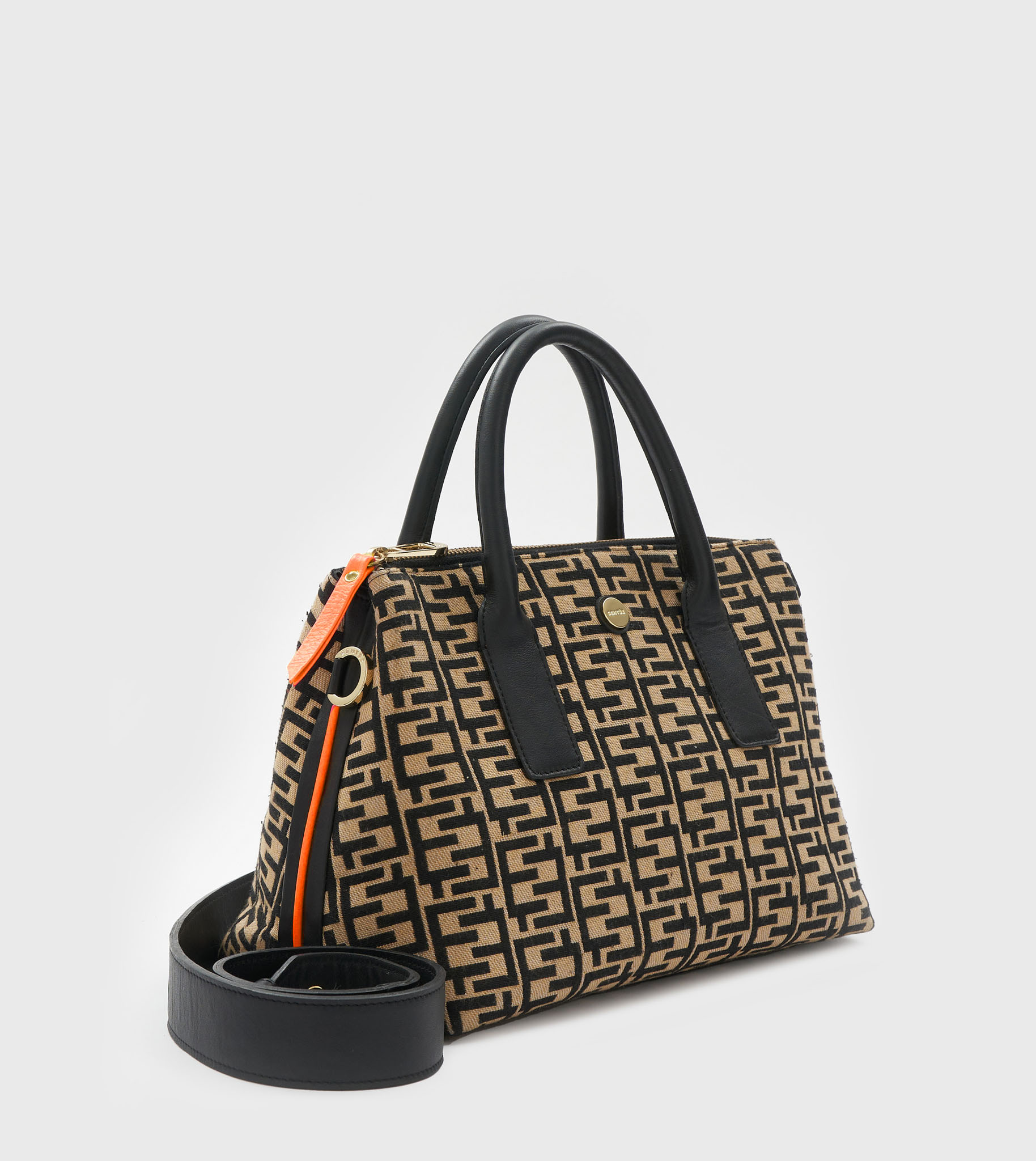 Bolso en jacquard con monogram Sentèz combinado con piel, detalle en laterales y tiracierre en piel fluo. Cierra con cremallera.